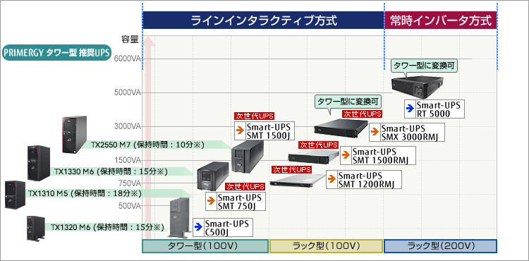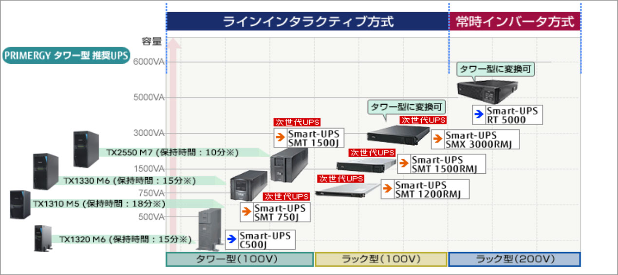 ※保持時間:UPSに接続する機器によって変動、詳細はバッテリー保持時間と消費電力の関係を参照ください。